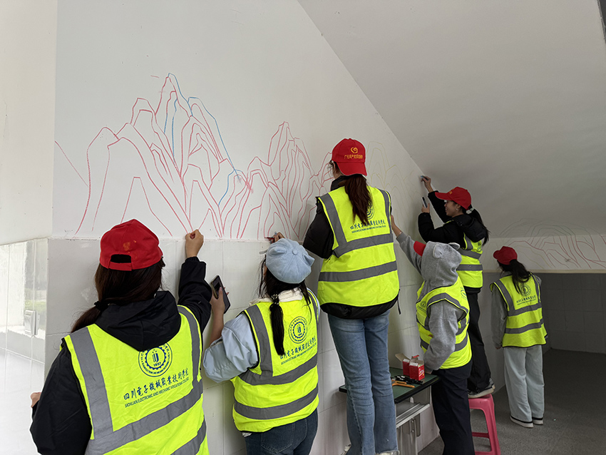 当建筑设计的笔触遇上乡村校园的纯真,当专业知识碰撞公益初心,会擦出怎样的火花?上周四、周五,二级学院团总支组建6名学生志愿者团队,带着建筑设计、室内艺术设计专业技能,跨越城市边界,前往四川省广元市青川县建峰镇中心小学校,开展了为期2天的“墙绘+地绘”志愿服务活动,为乡村孩子们送上了一份特别的“美育+智育”礼物。