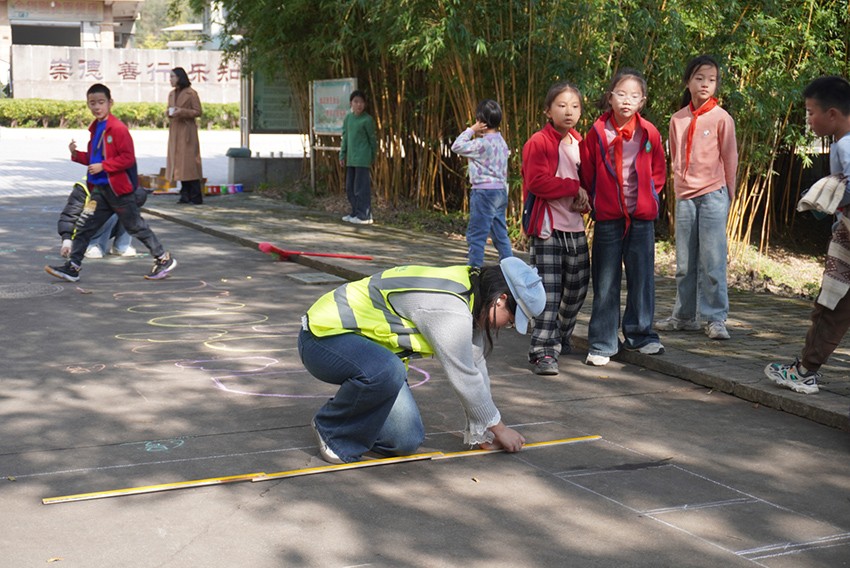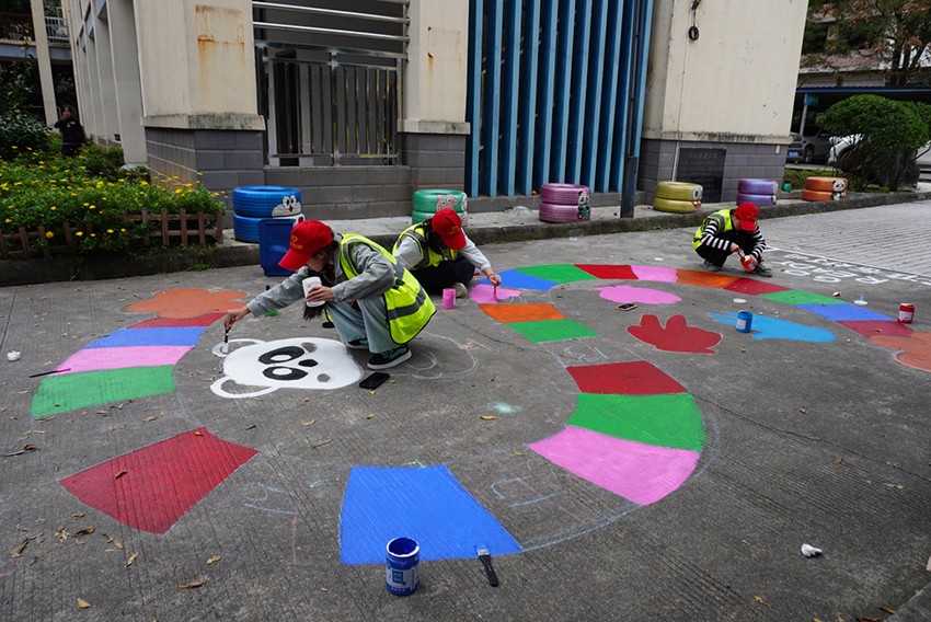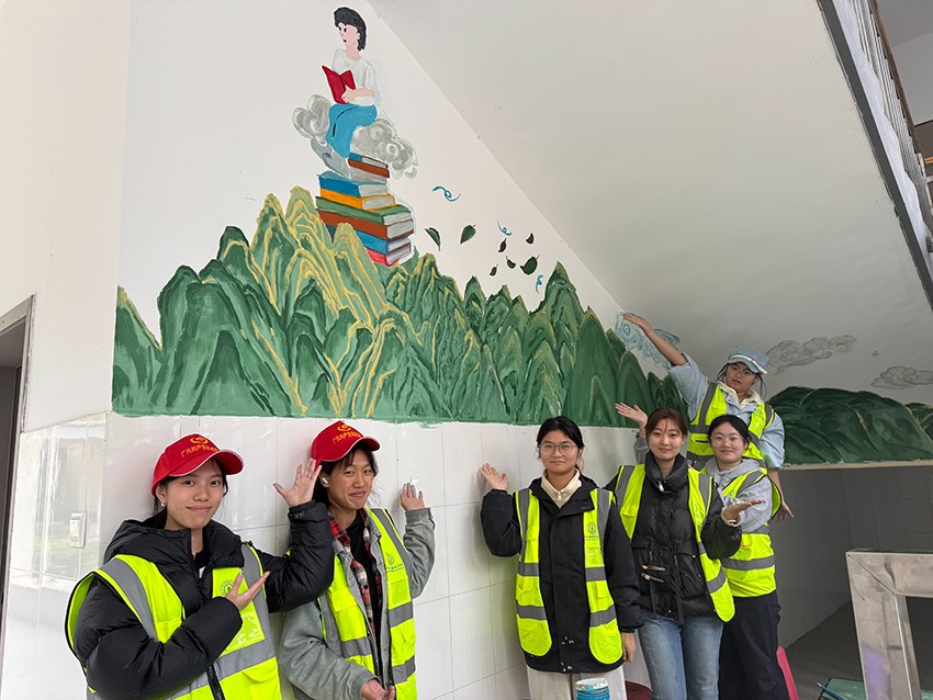 志愿服务的两天里,天气虽有风雨侵扰,却丝毫没有阻挡志愿者们的热情。调色盘不停转动,画笔在墙面、地面间游走,颜料沾满了衣袖、蹭脏了手掌,大家却笑着打趣“这是最特别的‘军功章’”。从清晨的轮廓勾勒到傍晚的细节填充,从地面游戏区的尺寸校准到墙面人物的神态刻画,志愿者们充分发挥专业所长,每一笔都凝聚着对乡村孩子的关爱。