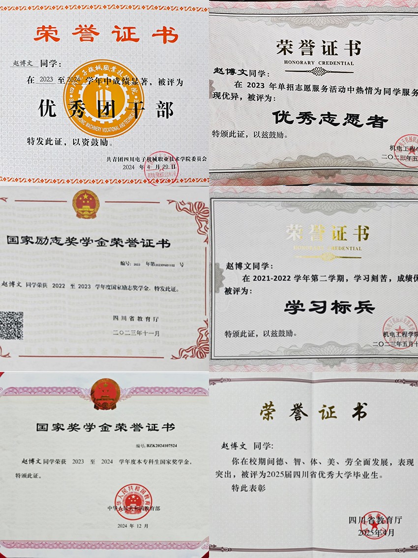 凭借出色的专业能力和扎实的学习态度,赵博文不仅荣获国家励志奖学金,更在毕业学年斩获国家奖学金、省级优秀毕业生这两个大学最高荣誉。他的专业成绩连续三年排名第一,常被学院评为“学习标兵”,成为同学们交口称赞的学习榜样。